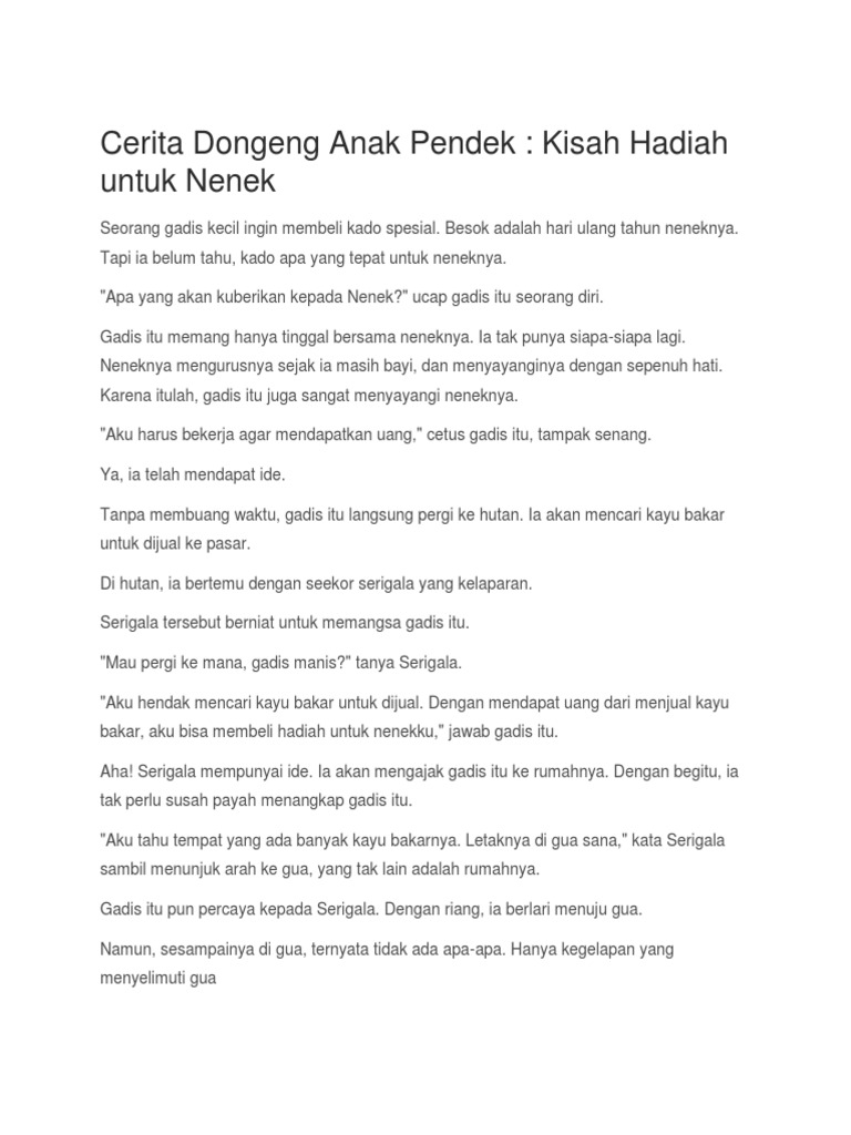 Berikut tiga rekomendasi dongeng anak pendek untuk mom. Once upon a time there was a prince who wanted to marry a princess; Dongeng anak pendek kali ini bercerita tentang seorang ayah dan anak yang hendak pergi ke pasar dengan membawa keledai. Untuk nenek seorang gadis kecil ingin membeli kado spesial. Memberikan kumpulan dongeng anak, cerita rakyat, dongeng binatang, dongeng pendek, cerita fabel, dan lainnya yang berhubungan dengan itu.